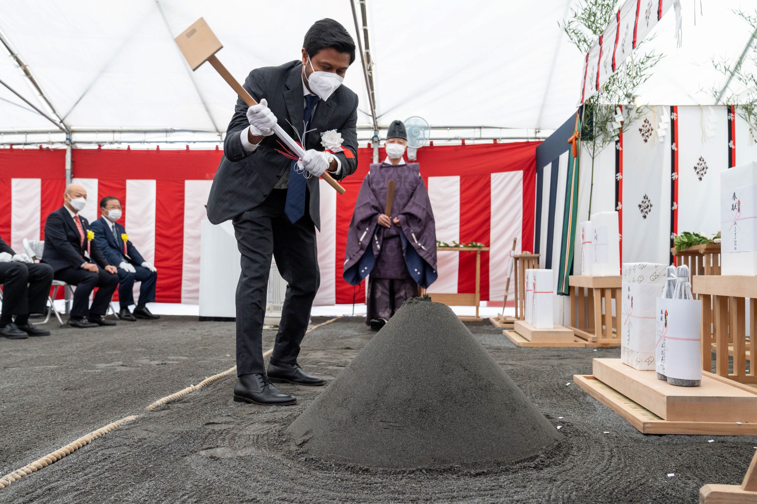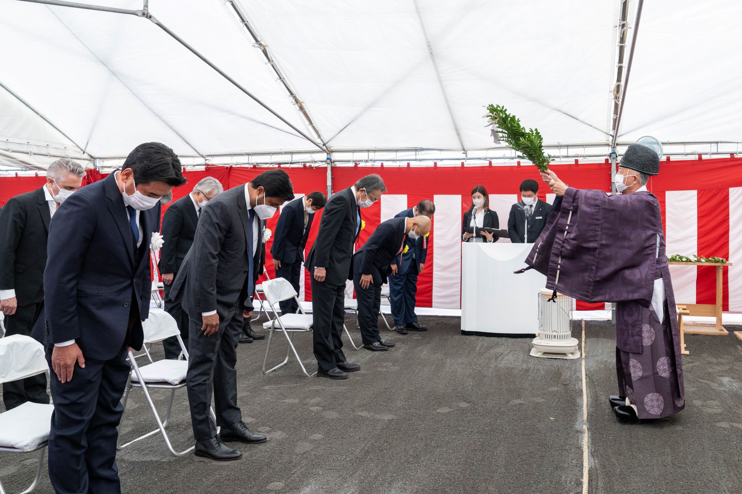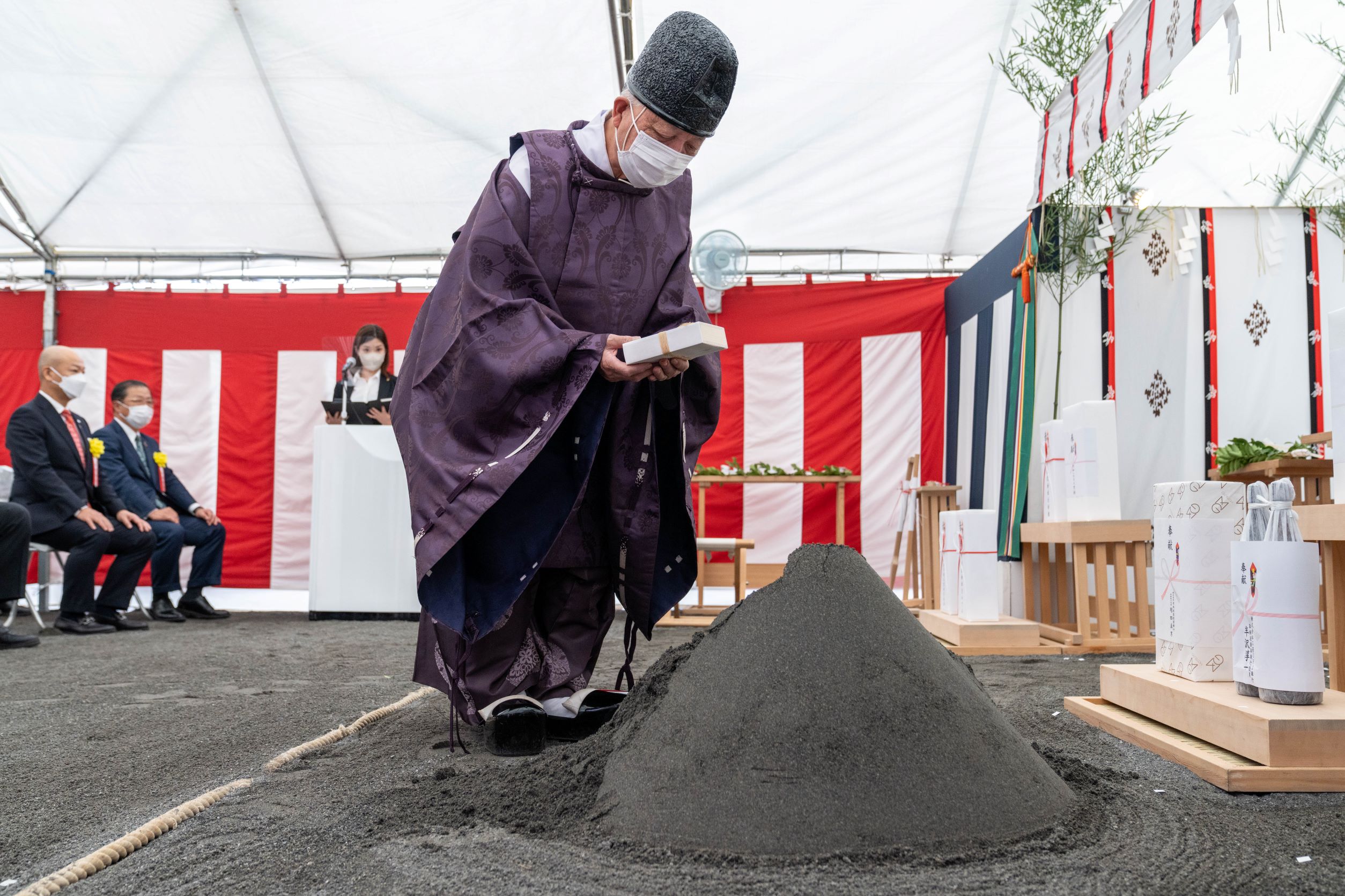 伝統的な形式に則って神官が土地を清め、工事が安全に、無事に完了することを祈願しました。